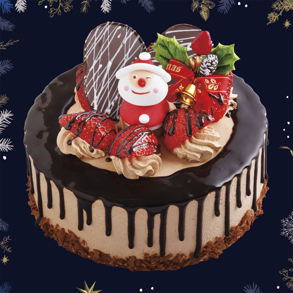 しっとりふんわりした生地にチョコ生クリームをサンドし、そして全体を包み、チョコレートソースのカーテンをまとってサンタと苺やチョコレートで飾りつけました。