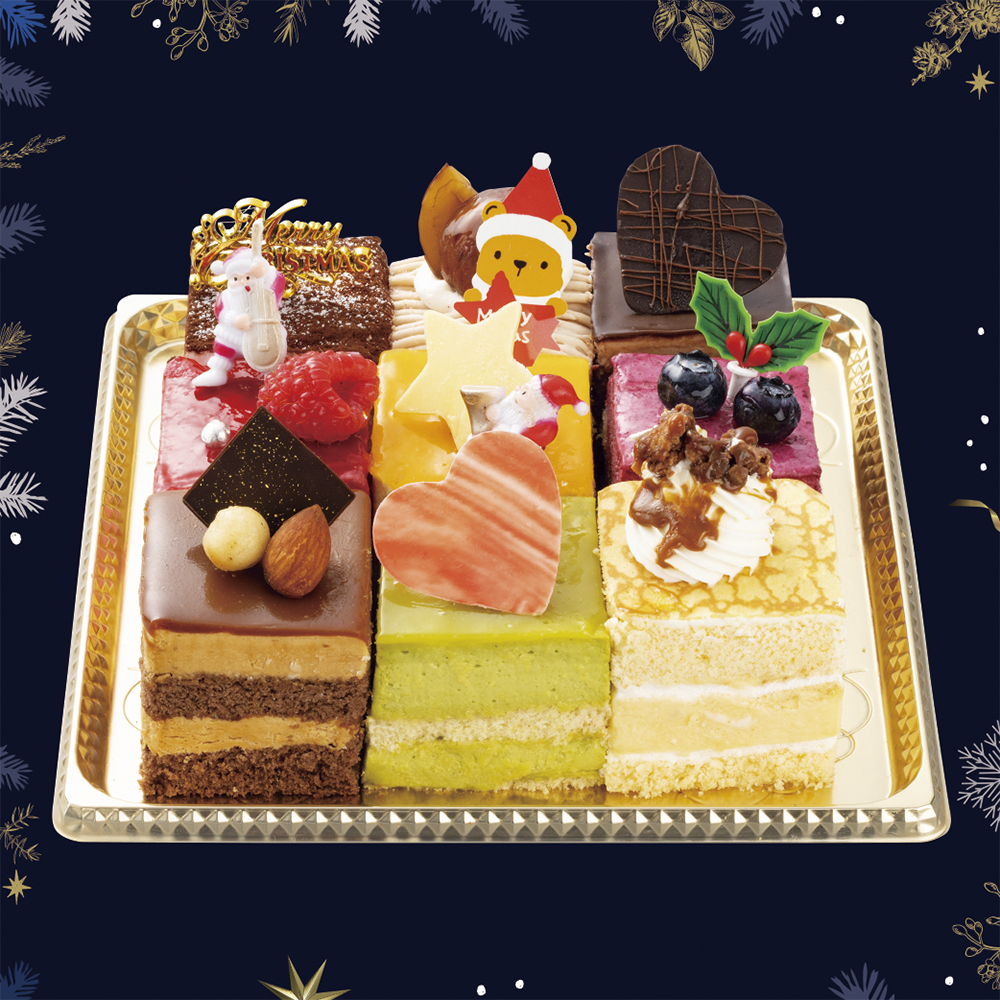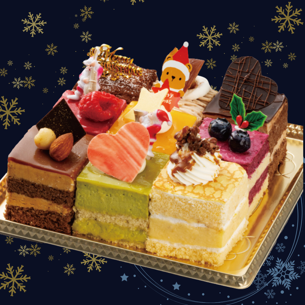 生チョコ、プリンショート(クレープ)、マロン、ラズベリー、レアチーズ、カシス、キャラメル、ピスタチオ、ティラミスの9種類の色んな味を楽しんで頂けるデコレーションケーキです。