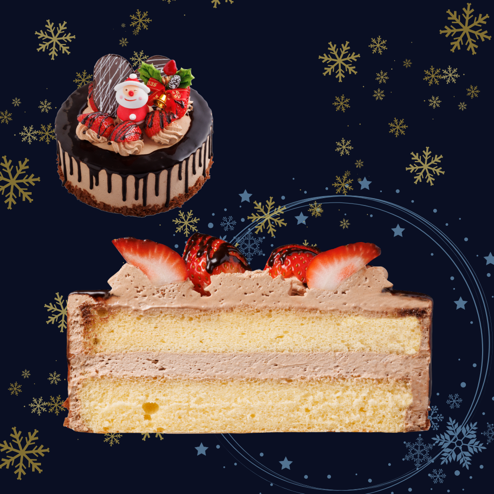 しっとりふんわりした生地にチョコ生クリームをサンドし、そして全体を包み、チョコレートソースのカーテンをまとってサンタと苺やチョコレートで飾りつけました。