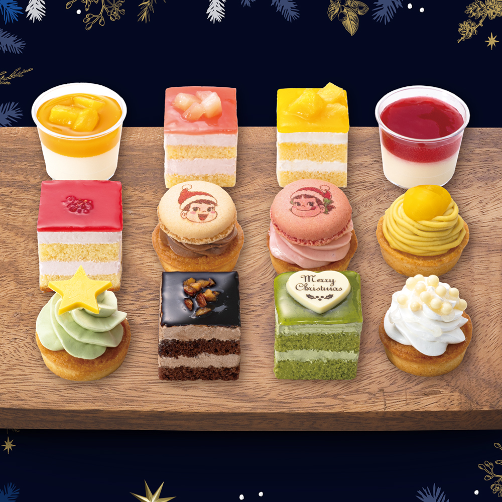 12種類のプチサイズのケーキを一度に楽しめるクリスマスパーティに最適なアソートケーキ。タルト、四角いケーキ、カップデザート等、色々な品目のケーキをプチサイズで少しずつ楽しめます。