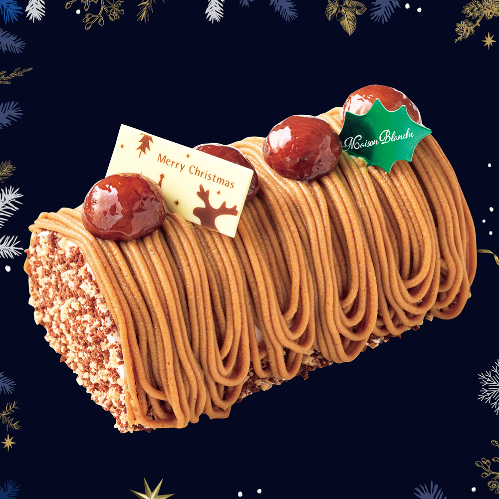 和栗ペーストを使用したクリームのロールケーキに渋皮栗をトッピングしました。