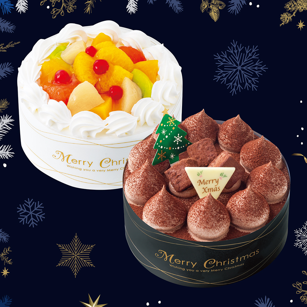 フルーツ(黄桃・白桃・パインアップル・ルビーグレープフルーツ・オレンジ・キウイフルーツ・レッドカラント)を使用したケーキと、チョコクランチをサンドし生チョコをトッピングしたチョコケーキです。
