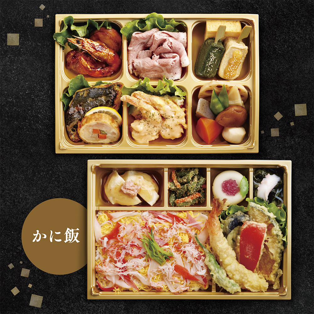 ・かに飯・季節の天ぷら・生麩・ホタテ海老照り焼き・さわら西京焼き・海老マヨ・八幡巻き・練り切り等