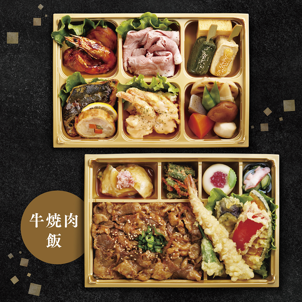 ・牛焼肉飯・季節の天ぷら・生麩・ホタテ海老照り焼き・さわら西京焼き・海老マヨ・八幡巻き・練り切り等